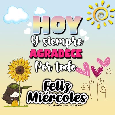 - Buenos días Feliz miércoles, que el cariño y la bondad iluminen tu camino, y que encuentres siempre razones para sonreír y dar gracias.