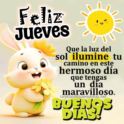 - Buenos días Que tengas un hermoso jueves. Recibe este saludo con afecto, un fuerte abrazo y mi deseo de que Dios guíe tu día con amor.