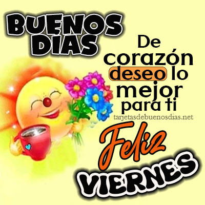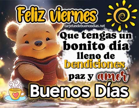 - Feliz Viernes Buenos días, que cada hora de este viernes llegue con buenas noticias, palabras amables, cariño en el ambiente y mucha paz interior.