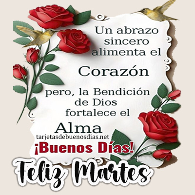 - Buenos días Que tengas un martes lleno de luz, con abrazos sinceros, palabras amables y cosas bonitas que te hagan sentir en paz.