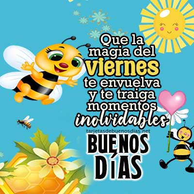 - Buenos días, feliz viernes. Que hoy tu sonrisa sea tan grande como tus sueños y que la alegría guíe cada paso que des.