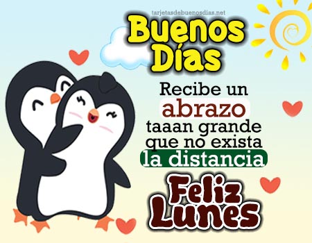 • Buenos días, feliz lunes. Te envío un abrazo sincero y el deseo de que tu semana esté llena de amor y bendiciones.