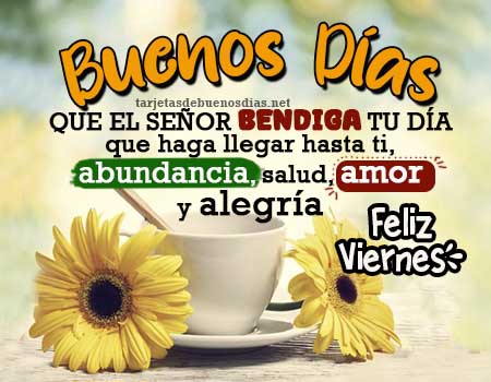 - Muy buenos días, Feliz viernes, que tengas un día maravilloso, con salud en tu cuerpo, amor en tu corazón y alegría en tu rostro. Buenos días, que la vida hoy te regale lo mejor