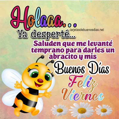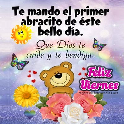 - Buenos días y feliz viernes, te mando un abrazo, que hoy tengas motivos para sonreír, personas que te amen y momentos que te llenen el alma de paz. Que la salud, el cariño y la alegría te acompañen en cada paso.