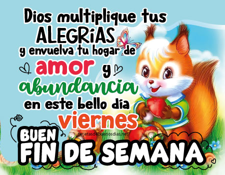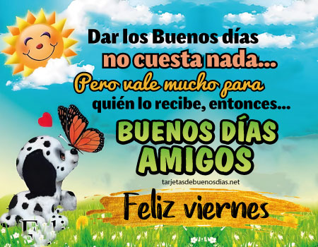 - Buenos días, recibe este viernes con alegría. Que tengas un día lleno de cosas bonitas y que no falten la salud, el amor ni la abundancia en tu vida y en la de los tuyos.
