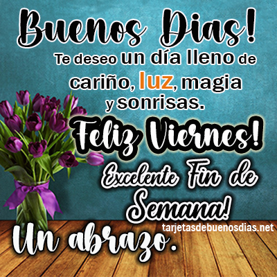 - Buenos días hermoso viernes, que este día esté lleno de razones para sonreír, con salud en abundancia y momentos simples que te llenen de felicidad.