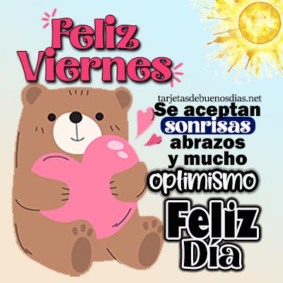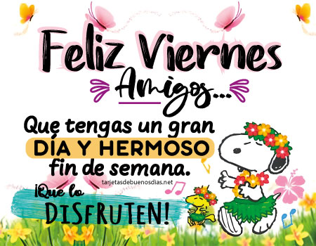 - Buenos días, feliz viernes. Que tengas un hermoso fin de semana y que puedas disfrutarlo en compañía de tus seres queridos.